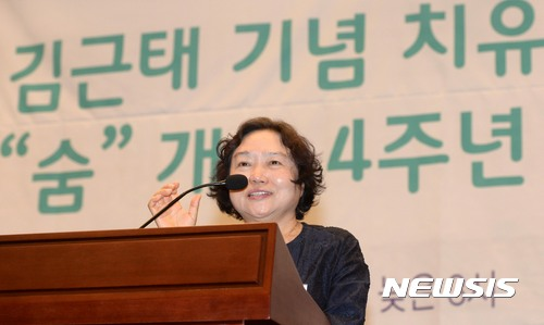 【서울=뉴시스】홍효식 기자 = 고 김근태 의장의 부인이자 김근태기념치유센터 공동대표인 더불어민주당 인재근 의원이 23일 오후 서울 여의도 국회 헌정기념관 대강당에서 열린 2017년 UN 국제 고문피해자 지원의 날과 김근태기념치유센터 개소 4주년 기념식에서 감사인사를 하고 있다. 2017.06.23.