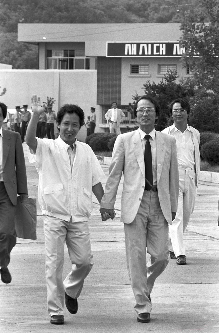 ▲ 김근태 의장과 장영달 부의장. 1988년 김근태 의장이 김천교도소에서 출소할 때의 모습