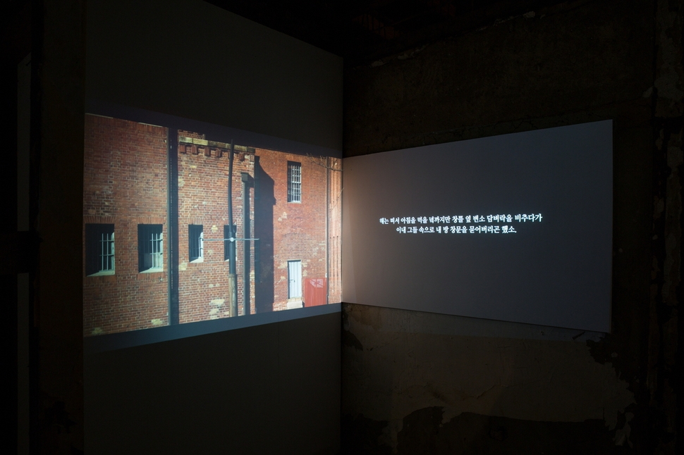 이 중 리슨투더시티의 <옥바라지>는 강력한 ‘현장성’으로 관객들을 빨아들인다. 리슨투더시티는 한때 김근태도 갇혀 있었던 서울구치소(서대문형무소) 인근 ‘옥바라지’ 골목 재개발 반대 운동을 벌이다 탄생한 작가그룹. 이들은 10년째 해고무효 투쟁을 벌여온 콜트콜텍 노동자들, 고공농성 중인 파인텍 노동자들, 강제철거에 반대하다 손가락이 잘린 족발집 사장, 또 이들을 뒷바라지하며 연대하는 시민들을 찾아다니며 비디오로 촬영했다. 화면 속 그들은 30여년 전 김근태와 부인 인재근(더불어민주당 의원)이 주고받은 편지를 찬찬히 읽는다. 어떤 의미에선 섬세한 감성을 지닌 남편보다 더 씩씩했던 인재근은 편지에 자주 ‘훌라송’을 써서 보냈다. “훌라훌라… 무릎 꿇고 사느니보다 서서 죽기를 원한다. 훌라훌라” 서러운 이들의 담담한 낭독이 전시장을 울린다.