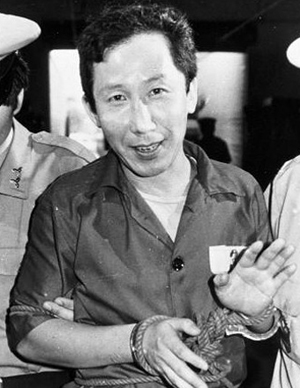 포승줄에 묶인 김근태 전민련 집행위원장이 손을 들어 인사하고 있다. | 경향신문 자료사진