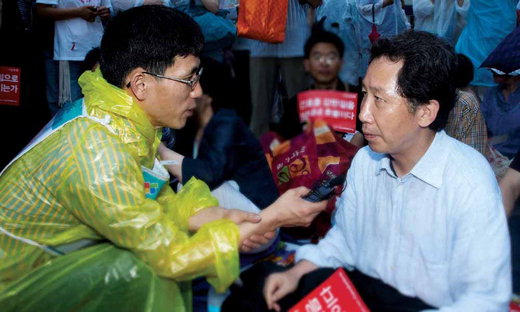 2008년 미국 쇠고기 반대 촛불집회 때 진중권 당시 중앙대 겸임교수(왼쪽)가 김근태 통합민주당 상임고문을 인터뷰하고 있다. | 경향신문 자료사진