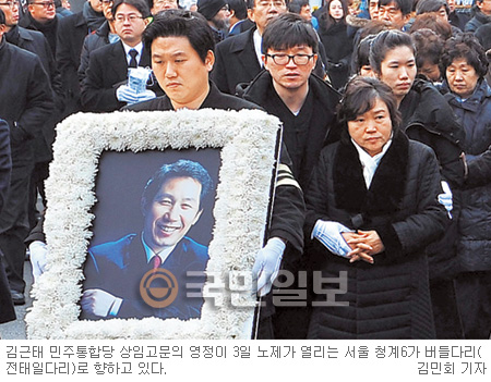 사랑도 명예도 이름도 남김없이…”3일 오전 7시 김근태 민주통합당 상임고문의 발인예식이 열린 서울대병원 장례식장. 100여명의 참석자들은 유족들의 마지막 조문을 지켜보며 나지막한 목소리로 ‘임을 위한 행진곡’을 불렀다. 지인들은 동지, 선배를 떠나보내는 마음에 흐르는 눈물을 훔쳐야 했다.