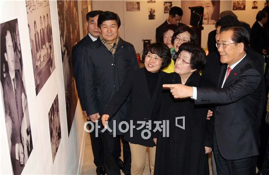 14일 오전 광주시 동구 중앙로 킴아트스페이스에서 열린 ‘보고싶다 민주야, 그립다 김근태’추모 사진전에 참석한 이희호 김대중 평화센터 이사장과 박준영 전남지사 등 참석자들이 추모사진전을 관람하고 있다.