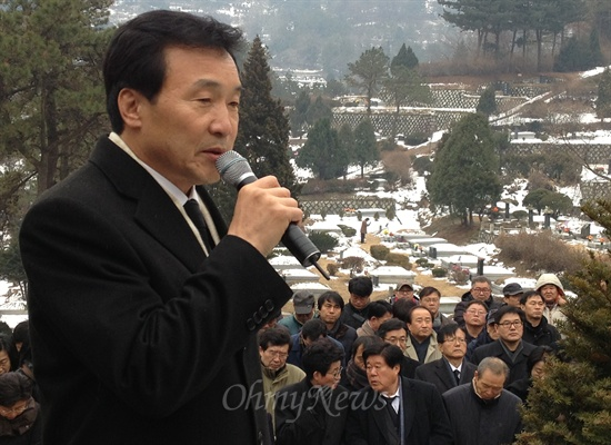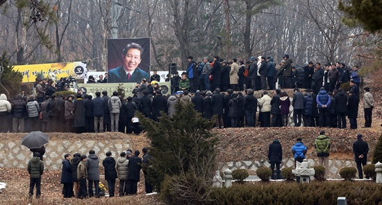 김 상임고문의 후배 장영달 전 의원 역시 “의장님을 보냈던 1년 전에는 그 숭고한 뜻을 성취하리란 마음으로 돌아섰는데 ‘오늘은 어찌해야 될지’하는 아득한 심정 등으로 여기 왔다”며 비통함을 드러냈다. “역사의 고비에서 우리는 길을 잃었고, 이렇게 힘들어 하는데 선배님은 곁에 안 계시다”던 장준영 전 청와대 시민사회수석은 추모사 중간 중간 말을 잇지 못했다. 추모 행사 내내 무덤가 주변에서 눈물을 훌쩍이는 소리가 끊이지 않았다.