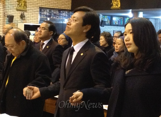 ▲ 12월 29일 서울시 도봉구 창동성당에서 열린 ‘민주주의자’ 김근태 민주통합당 상임고문 1주기 추모미사에 참석한 딸 병민씨 등이 손을 잡고 ‘사랑으로’를 노래하고 있다.