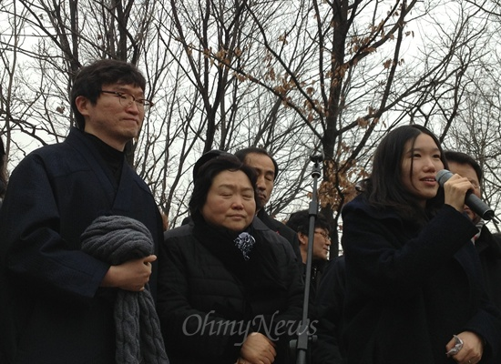 ▲ ‘민주주의자’ 김근태 민주통합당 상임고문의 1주기 추모행사에서 유족 대표로 감사 인사를 하고 있는 딸 병민씨. 왼쪽은 아들 병준씨, 가운데는 부인 인재근 의원.