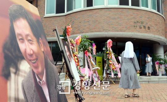국가폭력 피해자를 위한 김근태 기념 치유센터가 25일 서울 성북구 정릉동 ‘성가소비녀회’ 내 성재덕관 1층에 문을 열었다. 센터 앞에 김근태 전 의원을 추모하는 사진이 전시돼 있다. | 서성일 기자 centing@kyunghyang.com