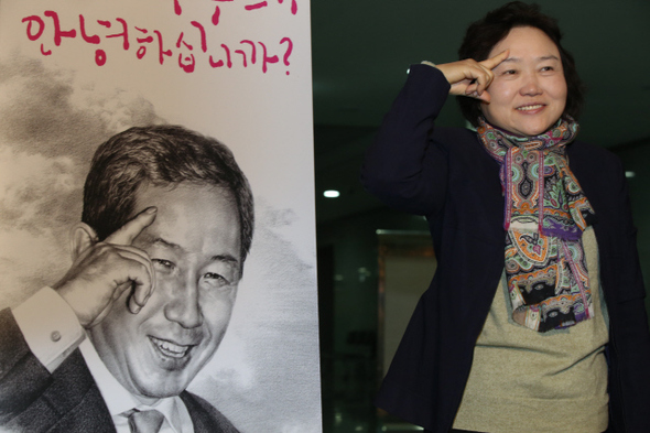 김근태 전 열린우리당 의장 2주기를 맞아 26일 오전 국회 의원회관에서 열린 <민주주의, 안녕하십니까?>사진전에서 부인 인재근 의원(민주당)이 고인의 몸짓을 흉내내고 있다. 추도미사와 추모식은 28일 오전 10시 서울 창동성당에서, 묘역 참배는 오후 1시 마석 모란공원 묘역에서 한다.