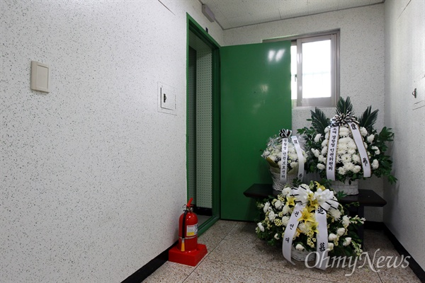 ▲ 조화 놓인 고 김근태 의원 고문 조사실 입구 1985년 당시 민주화운동청년연합 의장이었던 고 김근태 의원이 ‘고문기술자’ 이근안으로부터 살인적인 물고문, 전기고문 등을 받았던 서울 남영동 대공분실(현 경찰청 인권센터) 515호 조사실 앞에 조화가 놓여 있다(2012.1. 14.)