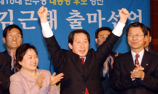 그는 2002년 16대 대선에 도전했다. 노무현 후보와 ‘개혁후보 단일화’를 조율하다 실패했다. 경선에 나섰지만 대세를 잡지 못하고 그해 3월 후보를 중도 사퇴했다. 그 후 노무현 대통령 만들기에 힘을 보탰다. 당시 정치판의 불법 정치자금의 악순환 고리를 끊기 위해 “2000년 전당대회 때 권노갑 고문에게 2000만원을 받았으며 2억4000만원을 선관위 신고에서 누락했다”고 ‘양심선언’했다. ‘원칙주의자 김근태’ ‘바보 김근태’의 두 목소리가 부딪친 시절이다.