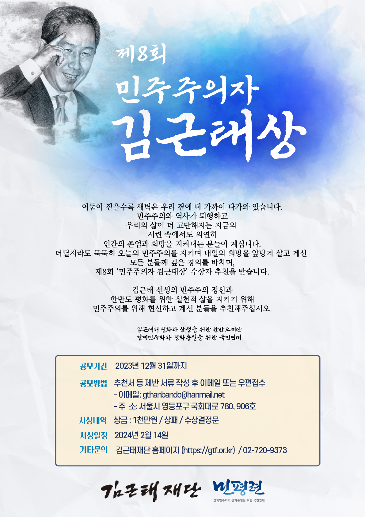 8회 ‘민주주의자 김근태상’ 수상자 추천과 신청을 받습니다.