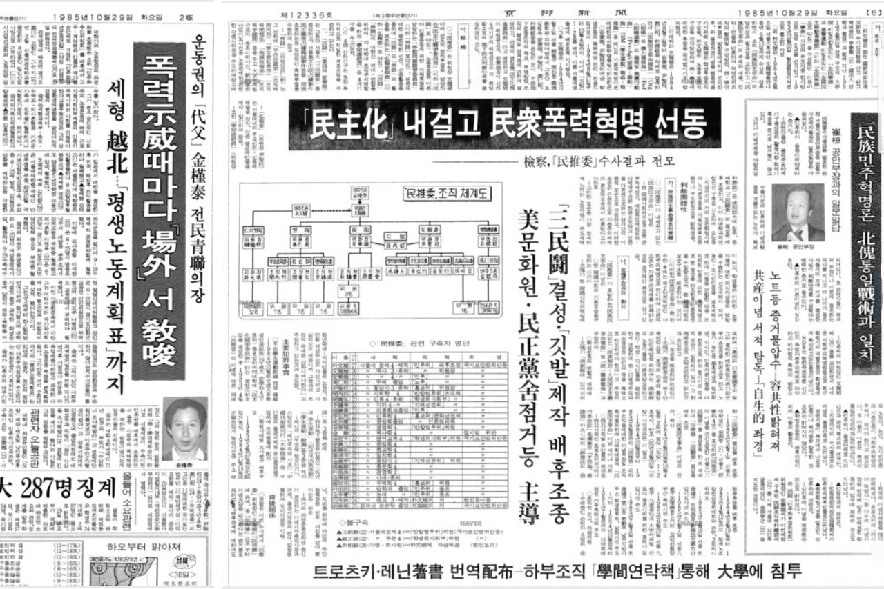 ▲ 1985년 10월 29일 서울대 민추위 사건에 대한 검찰의 수사결과를 보도한 경향신문. 이 사건의 배후가 민청련과 김근태 의장라는 검찰 발표를 그대로 베껴 쓰고 있다. 이 사건을 담당한 최환 공안검사의 인터뷰도 실려 있다. 2017년 개봉된 영화 [1987]에서 그는 박종철 고문사를 밝힌 의로운 영웅으로 묘사됐지만, 1985년의 그는 권력에 복종하는 다른 공안 검사와 다를 바 없는 인물이었다.