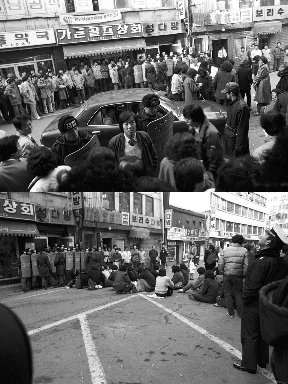 ▲ 1985년 12월 18일 민가협 현판식을 막아서는 경찰(위)과 사무실이 있는 거리 앞에서 농성중인 민가협 회원들(아래)