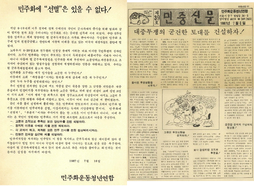 ▲ (왼쪽) 선별 석방을 비판하는 민청련 성명서. (오른쪽) ‘6.29선언’에 대한 민청련의 입장을 밝힌 [민중신문] 기사.