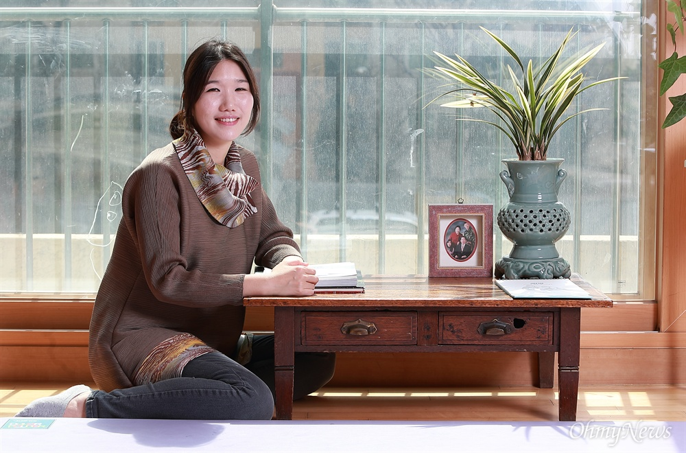 고 김근태 의원 딸 김병민씨가 아버지가 사용하던 오래된 책상앞에 앉아 있다.