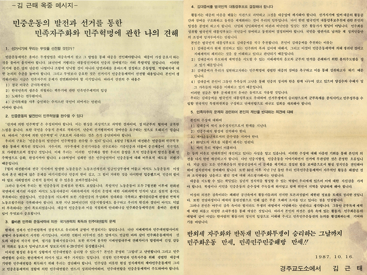 ▲ 민청련이 발표한 김근태 옥중 메시지