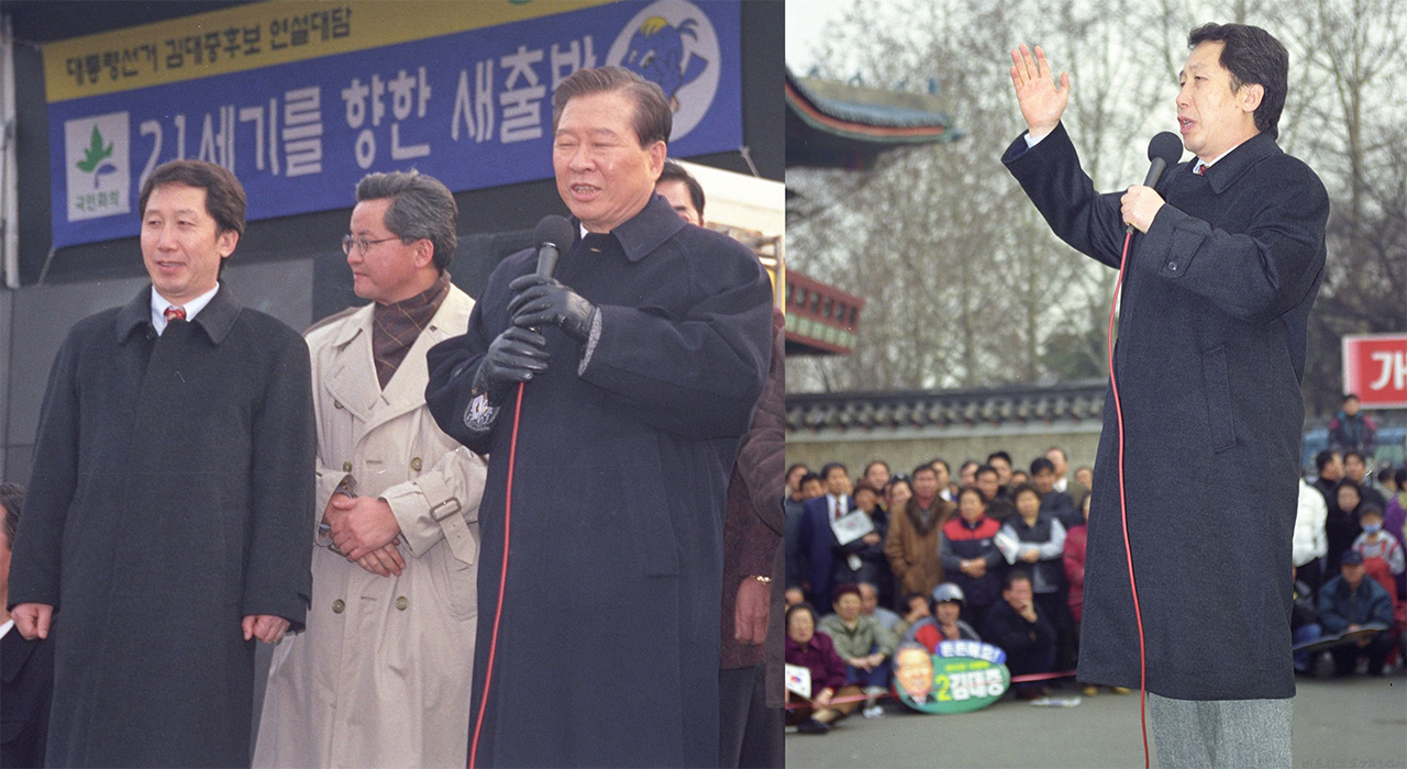 ▲ 옥중메시지를 전달한 1987년에서 10년이 지난 1997년 제15대 대통령 선거에서 김근태는 다시 한 번 김대중에 대한 ‘비지’를 내걸고 김대중의 대통령 당선을 도왔다. (왼쪽) 1997년 12월 1일, 캠프파랑새 유세장에서 연설하는 김대중 후보와 지원하고 있는 김근태, (오른쪽)같은 날 서울 어린이대공원 유세장에서 김대중 대통령 후보 지지 연설을 하고 있는 김근태