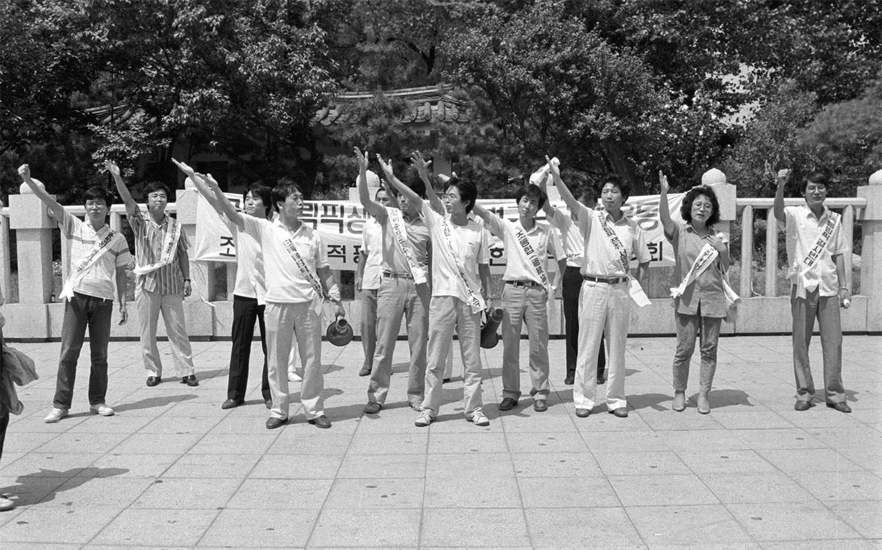 ▲ 1988년 7월 14일 종로2가 탑공공원 앞에서 재야단체 회원들과 함께 남북공동올림픽 개최 요구하는 민청련 회원들. 앞줄 왼쪽 첫 번째는 민중신문팀 최만영, 그 옆 핸드마이크 들고 있는 이는 정봉주, 그 옆은 사무국 총무부장 신기동, 한 사람 건너 동민청 위원장 김병태, 그 옆 북민청 총무 남정현.
