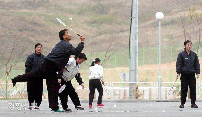 개성공단 신원에벤에셀에서 근무하는 북한 노동자들이 점심시간을 이용해 배드민턴을 치며 휴식을 즐기고 있다. 2006.4.28/사진공동취재단