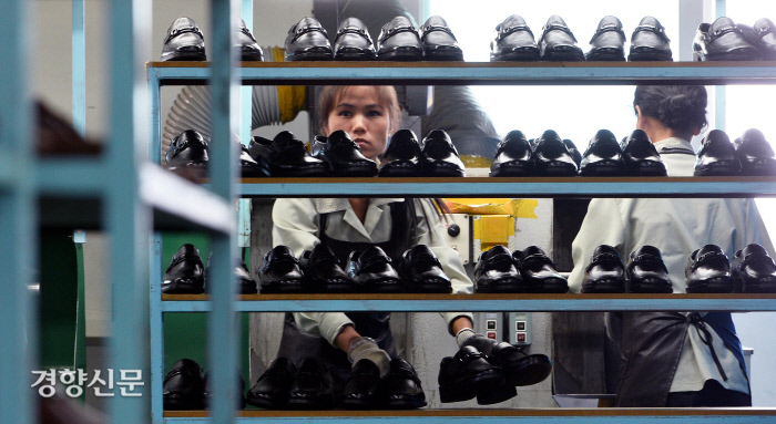개성공단 J&J에서 근무하는 한 북한 노동자가 생산된 신발을 정리하고 있다. 2013.09.17 /사진공동취재단