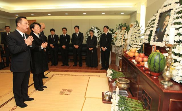 ▲박용만 대한상공회의소 명예회장(당시 두산그룹 회장)이 2011년 12월 서울대병원 장례식장에 마련된 고 김근태 민주통합당 상임고문의 빈소에 조문하고 있다. 한국일보 자료사진