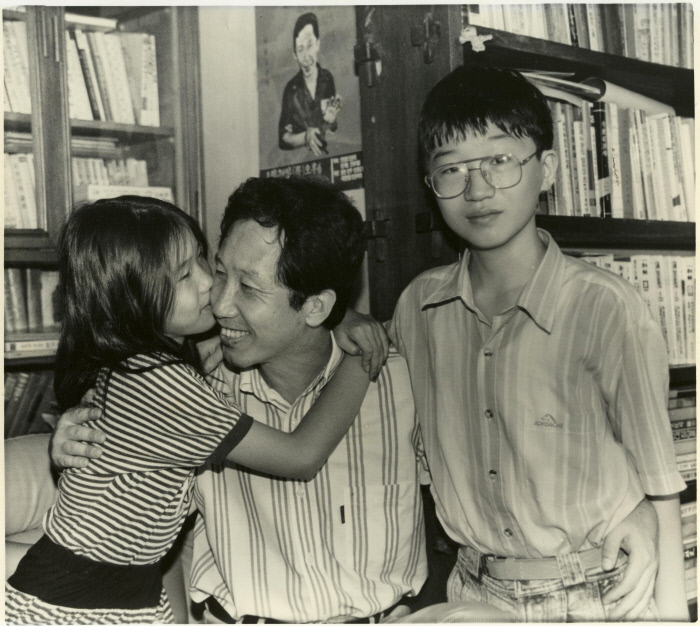 김근태 의장이 1992년 8월 홍성교도소에서 출소한 직후에 병준과 병민을 안고 기뻐하고 있다. 인재근 의원 제공