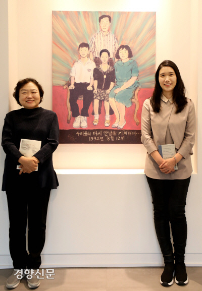 김근태 의장 가족의 사진을 그림으로 만든 작품 앞에서 인재근·김병민 모녀가 포즈를 취하고 있다. 김기남 기자