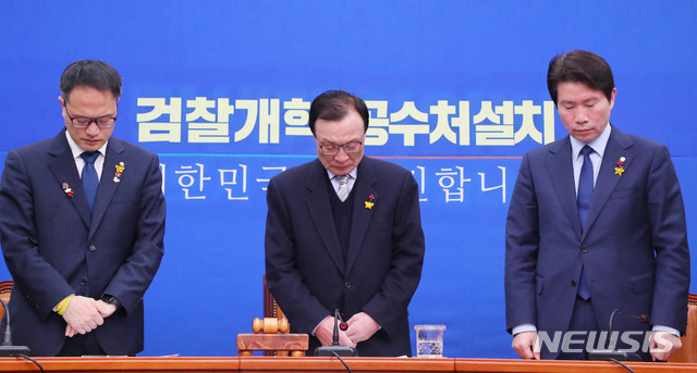 [서울=뉴시스] 장세영 기자 = 이해찬(가운데) 더불어민주당 대표를 비롯한 참석자들이 30일 서울 여의도 국회에서 열린 더불어민주당 최고위원회에 참석해 고 김근태 의원의 추모하는 묵념을 하고 있다. 2019.12.30.
