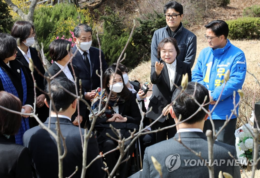 (남양주=연합뉴스) 김병만 기자 = 고(故) 김근태 전 열린우리당 의장의 부인인 더불어민주당 인재근 의원이 28일 경기도 남양주 모란공원 내 고 김 의장 묘역을 참배하러 온 더불어시민당 비례대표 후보들에게 감사 인사를 전하고 있다.