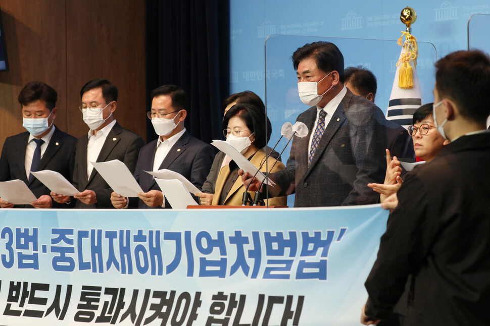 더불어민주당 민주평화국민연대 소속 의원들이 18일 국회 소통관에서 공수처, 공정경제 3법, 중대재해기업처벌법 처리를 촉구하고 있다. 연합뉴스