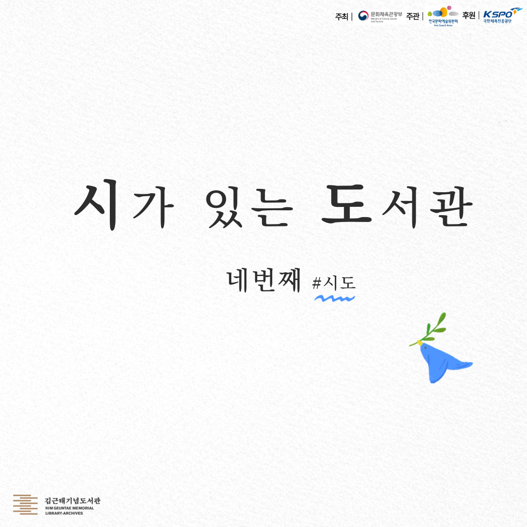 링크로 공유하기 인스타그램 공유하기 페이스북 공유하기 모집완료 [김근태기념도서관] [도서관상주작가] '시'가 있는 '도'서관_네번째 김근태재단2023.11.14 진행일자 2022.05.10 ~ 2022.05.10