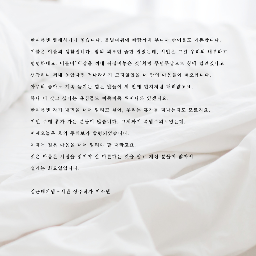 링크로 공유하기 인스타그램 공유하기 페이스북 공유하기 모집완료 [김근태기념도서관] [도서관상주작가] '시'가 있는 '도'서관_열일곱번째 김근태재단2023.11.14 진행일자 2022.08.09 ~ 2022.08.09 [김근태기념도서관 바로가기]