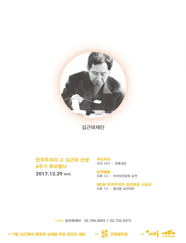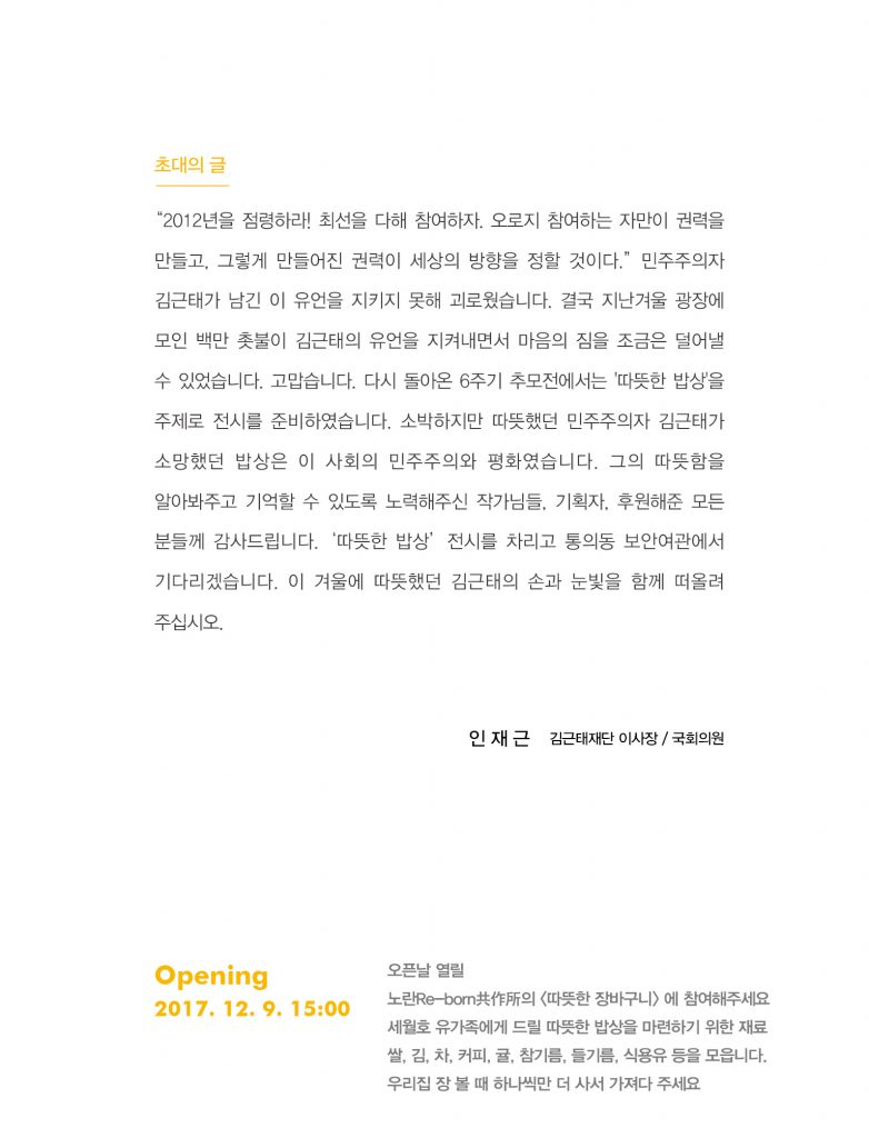 링크로 공유하기 인스타그램 공유하기 페이스북 공유하기 [알림] 민주주의자 고 김근태 선생 6주기 추모전 김근태재단2017.12.01 ◇ 전시회 일정 : 12월 9일(토)~29일(금)/오전 10시 30분~오후 6시 – 오프닝 행사 : 12월 9일(토) 오후 3시 ◇ 장소 : 통의동 보안여관(종로구 효자로 33)