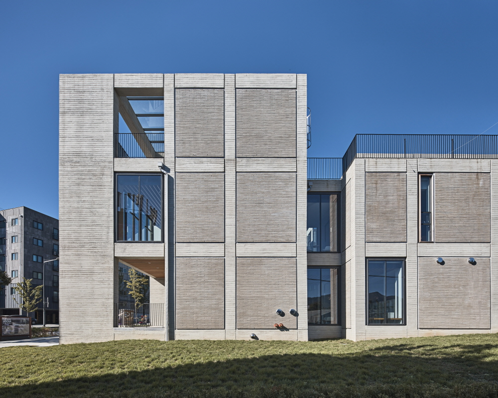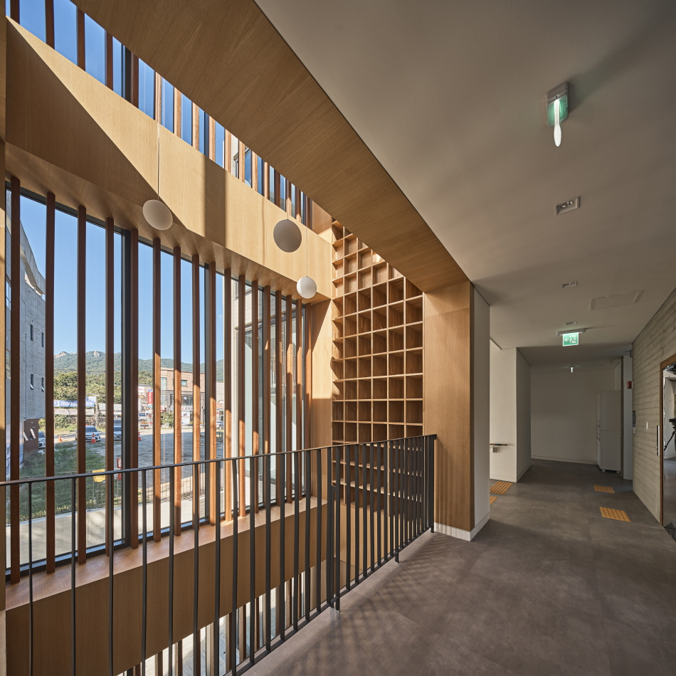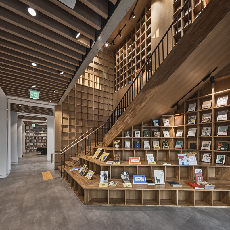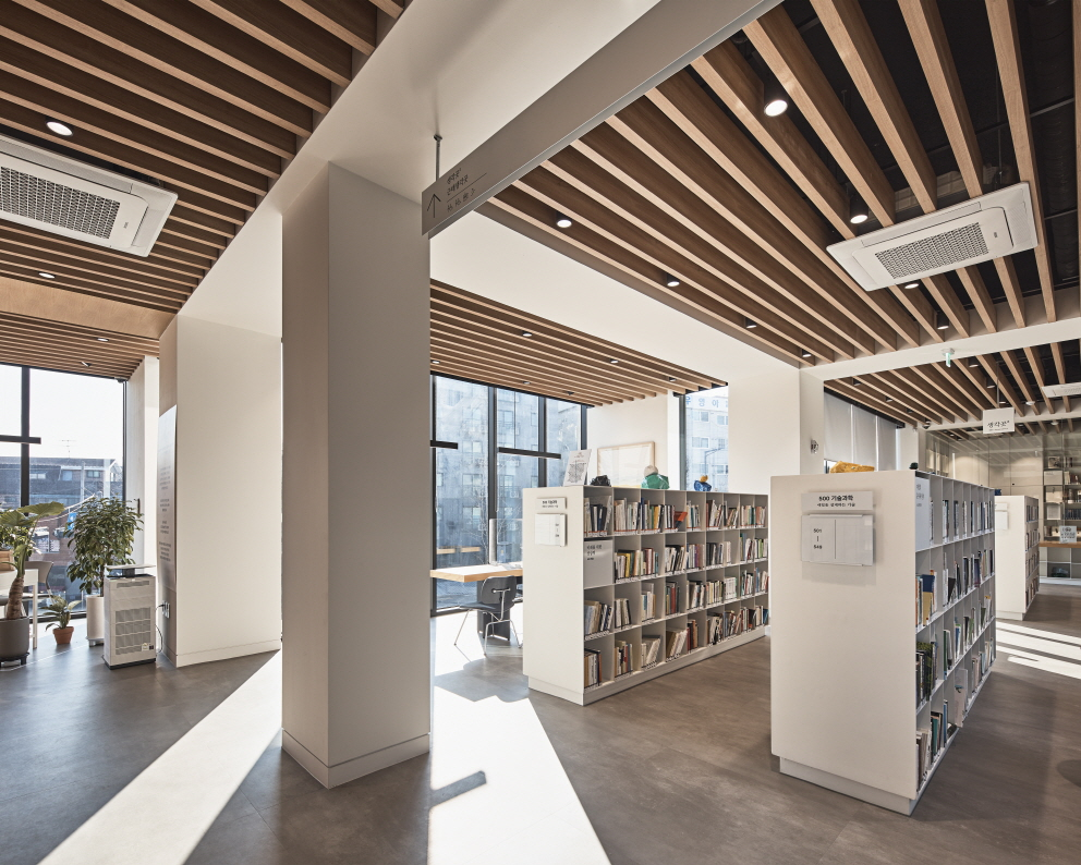 달팽이를 닮은 대지. 그 안에 잠재된 수많은 건축적 가능성 중 하나를 불러내는 일은 단순한 그리드의 규칙을 부여하는 것에서 시작되었다. 그리드 체계는 건물의 골조와 외부 바닥의 패이빙 패턴, 내부 공간에 이르기까지 적용되며, 안으로는 효율적 공간구조를 제공하는 한편 밖으로는 대지 경계와의 상호작용을 통해 대지가 품어온 숨은 공간 조직을 드러낸다. 이렇듯 대지 전체에 걸쳐 체계화된 그리드의 사이공간은 ‘INFILL SYSTEM’으로 채워진다. 외부 입면은 벽돌, 유리, 목재, 창호, 문 등의 건축 재료와 요소로, 내부는 서가, 책상, 벽과 같은 물리적 요소와 더불어 도서관 사용자의 다양한 표정과 행위로 그 “채워짐”을 완성한다.