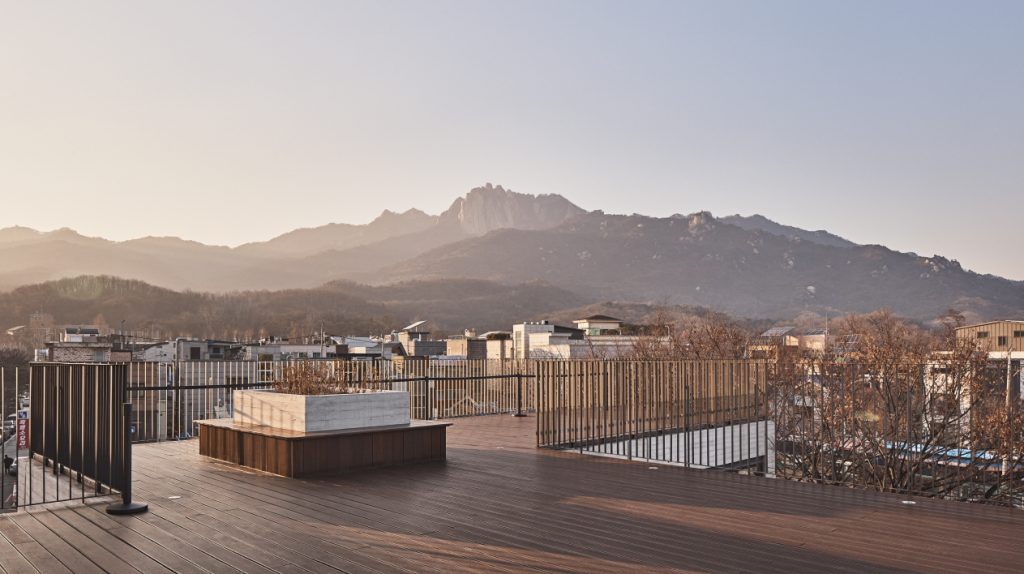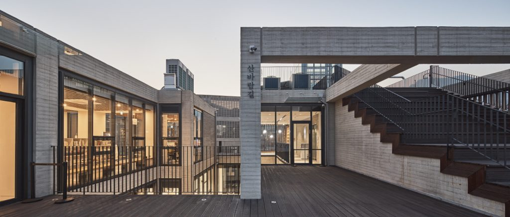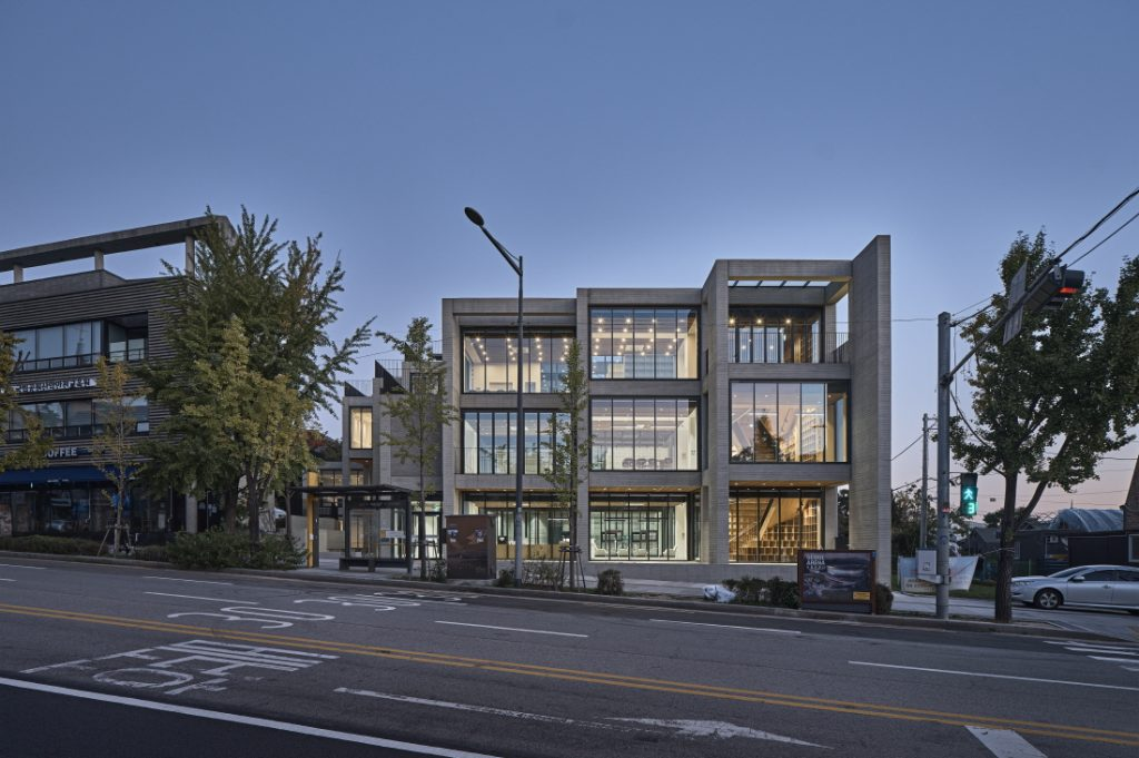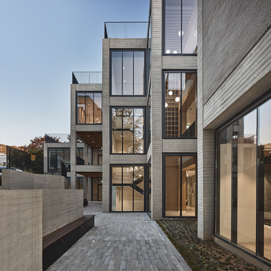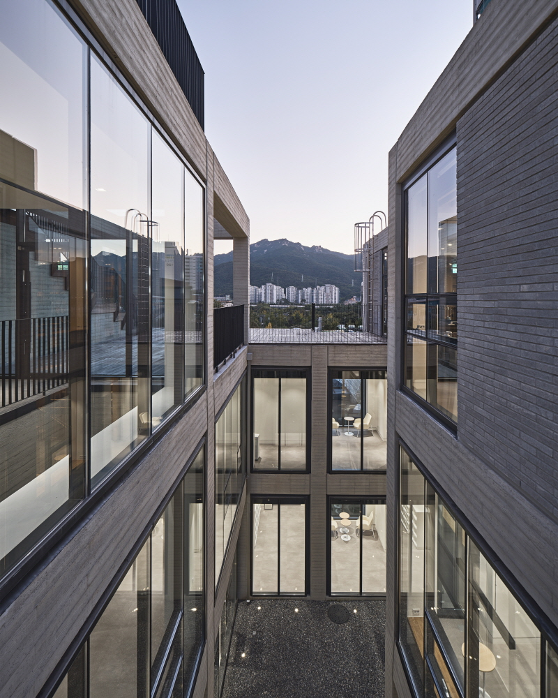 2개의 필지로 구성된 대상지에 하나로 작동하는 공간을 만들기 위해 두 건물의 양 끝은 브리지형 통로로 연결된다. 연결되고 남은 사이의 외부공간은 자연스레 두 공간의 중정으로 자리하고, 건물의 내부에 다시 외부를 품으면서 겹겹의 공간과 깊이를 만들어 낸다. 중정을 중심으로 순환하며 내·외부가 반복되는 공간구조는 너와 나, 서로를 확인하는 경험을 제공한다.